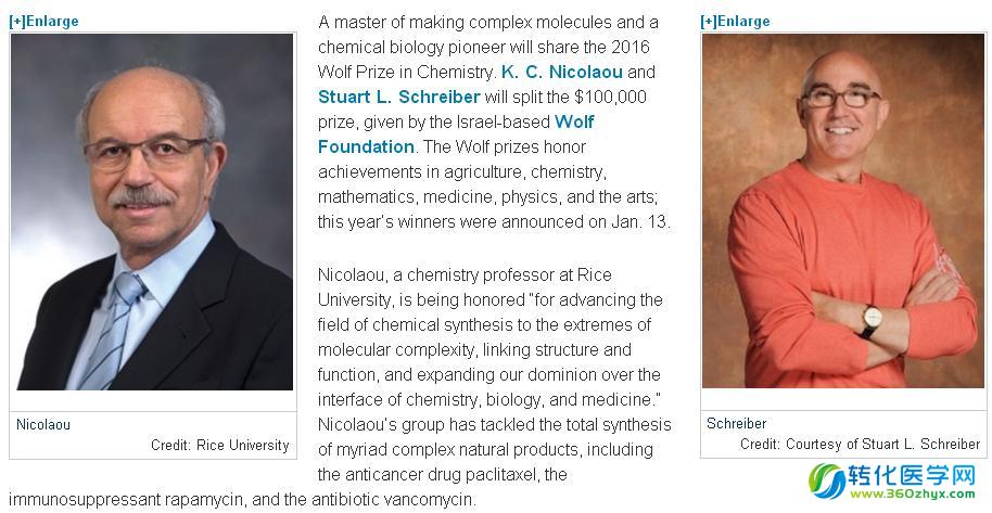 化学奖获奖者:基里亚科斯·尼科拉乌(Kyriacos Nicolaou) 和斯图亚特·施赖伯(Stuart Schreiber)。基里亚科斯·尼科拉乌获奖是因为他开创性的合成出在自然界发现的复杂的有机分子; 而斯图亚特·施赖伯因为他在化学生物学和小分子作为药用探针方面的研究; 2006年,阿达·约纳特(Ada Yonath,1939-)与乔治?费埃尔因在“核糖体蛋白合成,光合作用中的光反应”领域中获得突出成就,获得沃尔夫化学奖。3年之后,阿达·约纳特便获得了2009年诺贝尔化学奖,也是45年当中唯一一位获得诺贝尔化学奖的女科学家。