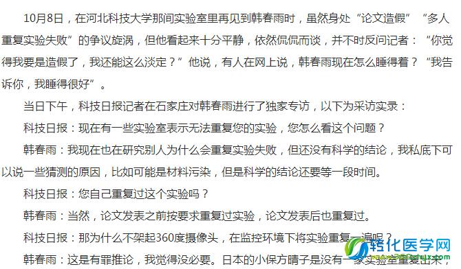 紧接着,科技日报发表文章《韩春雨回应“重复实验失败“:我为什么要自证清白》