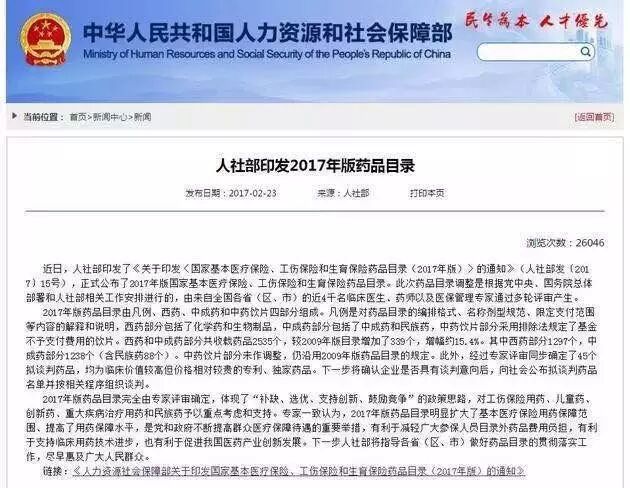 昨日(2月23日),人社部网站发布《关于印发〈国家基本医疗保险、工伤保险和生育保险药品目录(2017年版)〉的通知》,公布了2017年版国家基本医疗保险、工伤保险和生育保险药品目录。
