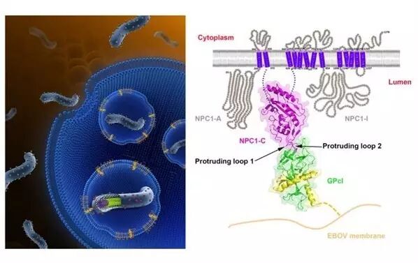 埃博拉病毒入侵宿主细胞模式图(左)博拉病毒表面激活态糖蛋白GPcl与其宿主的内吞体内受体NPC1的复合物三维结构图(右).