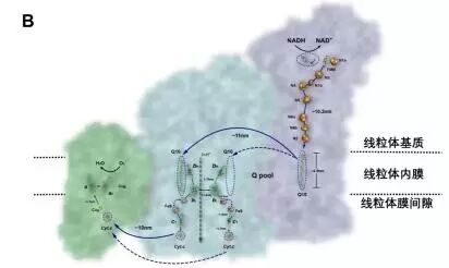 呼吸作用是生命体最基础的生命活动之一。由位于线粒体内膜的氧化磷酸化系统完成,为细胞提供能量。人类线粒体呼吸链氧化磷酸化系统异常会导致多种疾病,如阿尔茨海默病、帕金森病、多发性硬化、少年脊髓型共济失调以及肌萎缩性脊髓侧索硬化症等。哺乳动物呼吸体是由包括44个膜蛋白在内的81个蛋白亚基(69种不同蛋白分子)所构成的分子量高达1.7兆道尔顿的超级膜蛋白分子机器。清华大学杨茂君研究组先后在《自然》(Nature, 2016, 537: 639–643)和《细胞》(Cell, 2016,167:1598–1609)杂志发文,报道了呼吸链超级复合物结构。该结构是目前所解析的最复杂的非对称性膜蛋白超级分子机器的结构(图A,B),为进一步理解哺乳动物呼吸链超级复合物的组织形式、分子机理以及治疗细胞呼吸相关的疾病提供了重要的结构基础。