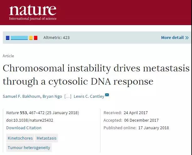 参考资料:Samuel F. Bakhoum, Bryan Ngo, Ashley M. Laughney, Julie-Ann Cavallo, Charles J. Murphy, Peter Ly. Chromosomal instability drives metastasis through a cytosolic DNA response.