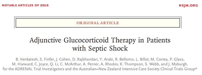 第二篇是由澳大利亚-新西兰重症监护协会临床试验小组发表于2018年1月19日的文章《Adjunctive Glucocorticoid Therapy in Patients with Septic Shock》,该文探讨了氢化可的松对感染性休克患者的治疗效果。