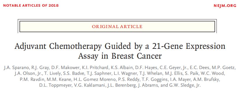 第六篇是来自Montefiore Medical Center的研究团队发表的《Adjuvant Chemotherapy Guided by a 21-Gene Expression Assay in Breast Cancer》研究者们汇报了一种针对乳腺癌的辅助性化疗报告。