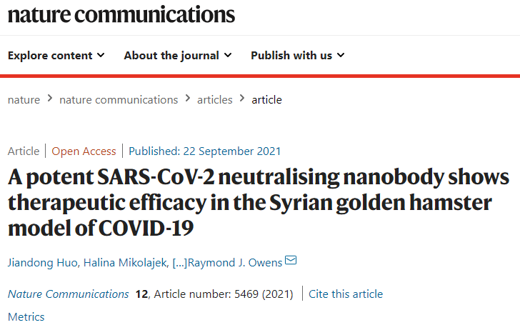 研究人员将一项新的研究结果于9月22日发表在《Nature Communications》杂志上,发表了一篇题为“A potent SARS-CoV-2 neutralising nanobody shows therapeutic efficacy in the Syrian golden hamster model of COVID-19”的文章。他们发现,这种短链的分子可以在实验室大量生产,当给受感染的动物模型注射时,可以显著减少新冠病毒疾病的症状。
