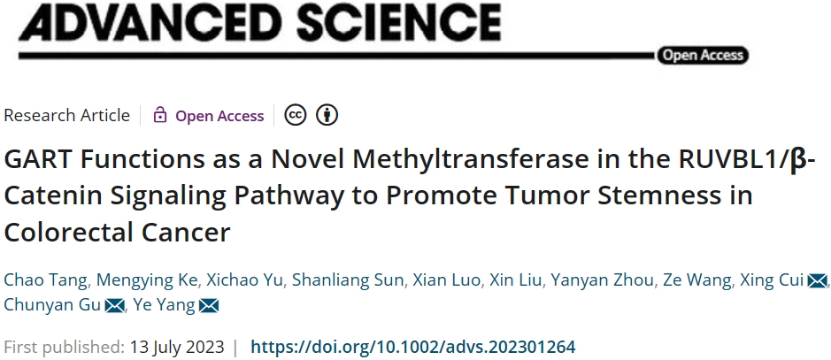 近日,南京中医药大学和山东中医药大学研究人员共同在知名期刊《Advanced Science》发表了题为“GART Functions as a Novel Methyltransferase in the RUVBL1/β-Catenin Signaling Pathway to Promote Tumor Stemness in Colorectal Cancer”的研究论文,该研究旨在确定GART增强CRC细胞干性的潜在机制,以开发新的治疗方法。GART水平升高与CRC患者的不良预后相关,并促进CRC细胞的增殖和迁移。GART表达增加的CD133+细胞在体外和体内都具有更高的致瘤和增殖能力。