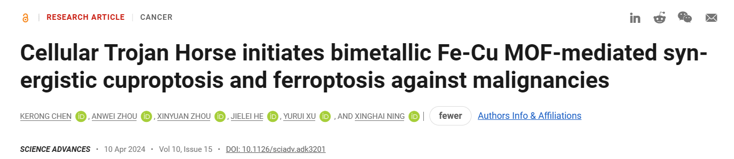 4月10日,南京大学宁兴海、徐郁蕊共同通讯在期刊《Science Advances》上在线发表题为“Cellular Trojan Horse initiates bimetallic Fe-Cu MOF-mediated synergistic cuproptosis and ferroptosis against malignancies”的研究论文,这项研究为恶性肿瘤中铜和铁稳态之间复杂的相互作用提供了深刻的见解,可能为癌症治疗的创新方法铺平道路。