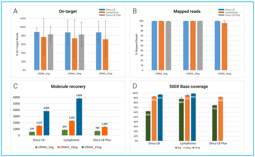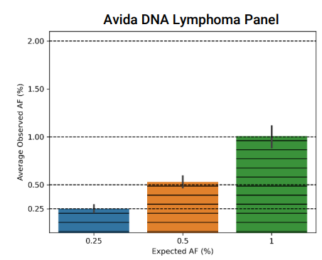 cfDNA 样品(Biochain p/n Z2121001)使用 Avida DNA Onco LB 和 Avida DNA 淋巴瘤 Panel 进行检测,投入量分别为 3 ng(n=4)、10 ng(n=4)和 25 ng(n=3)。Avida DNA Onco LB Plus panel 仅在投入 3 ng 和 10 ng 的 DNA 时进行了测试。测序在 Element AVITI 测序仪上进行。