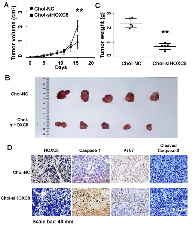 HOXC8 shRNAs 能够强烈诱导细胞焦亡,这促使研究人员研究其对肺腺癌细胞肿瘤发展的效果。研究结果表明,脂质偶联的 HOXC8 siRNA 能够抑制肺腺癌细胞的肿瘤发展。为了确保肿瘤发展受阻与 HOXC8 减少所导致的细胞焦亡有关,研究人员进行了免疫组织化学分析,以检测从 Chol-NC 和 Chol-siHOXC8 组取出的肿瘤中 HOXC8、caspase-1、Ki67 和裂解的 caspase-3 的丰度。与 Chol-NC 组相比,Chol-siHOXC8 组肿瘤中 HOXC8 的染色明显降低,这证实了 HOXC8 耗竭的有效性。从 Chol-NC 组切除的肿瘤中,caspase-1 染色较弱,而 Ki67 染色较强。相反,来自 Chol-siHOXC8 组的肿瘤中 caspase-1 染色较强,而 Ki67 染色显著减少。此外,研究人员未能在两组肿瘤中检测到裂解的 caspase-3 染色。这些结果进一步证明,HOXC8 敲低通过 caspase-1 相关的细胞焦亡而非细胞凋亡抑制肿瘤的发展。