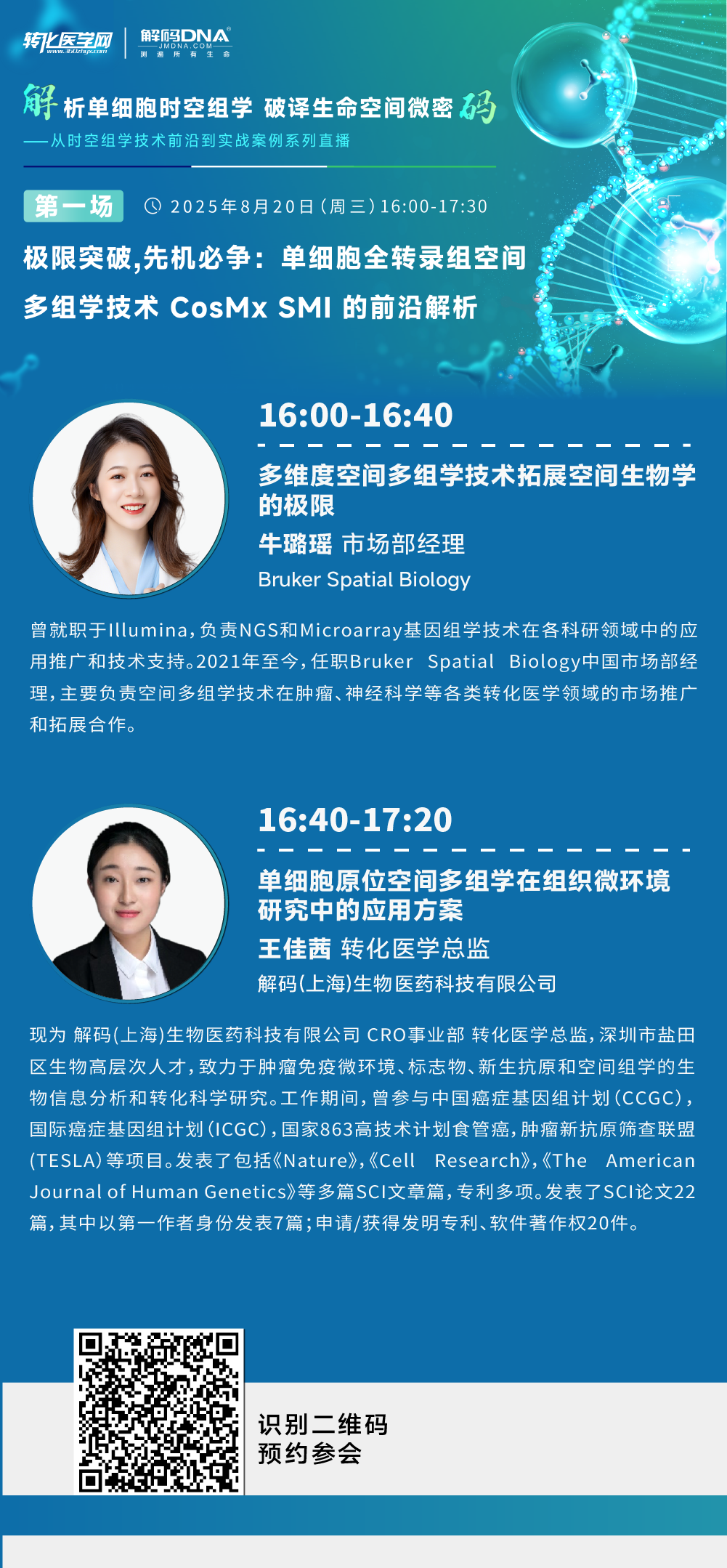 在生命科学研究的浪潮中,时空组学技术正以突破性力量推动生命科学研究的变革,从微观基因表达的时空动态解析到宏观疾病机制的探索,其应用价值已成为全球科研与行业领域的焦点。然而,该领域涉及多学科交叉,研究者在技术选型、产品应用、场景转化及数据分析中常面临认知壁垒。为帮助科研人员系统梳理时空组学的核心脉络,解码生物联合转化医学网将推出“解析单细胞时空组学,破译生命空间微密码 —— 从时空组学技术前沿到实战案例”系列直播,聚焦技术本质、产品实践、临床转化与数据分析四大核心维度,希望通过四场层层递进的深度解析,助力受众打通从理论到实践的全链条认知,真正“吃透”时空组学的核心逻辑与应用价值。