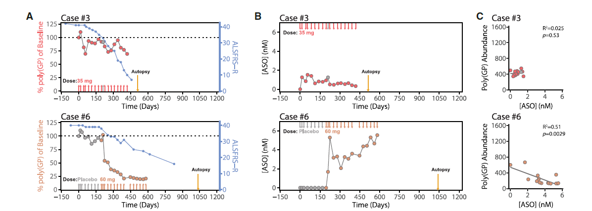 ASO治疗后c9ALS患者体液生物标志物分析:免疫测定ASO治疗后的c9ALS患者脑脊液中poly(GP)(DPR标志物)和BIIB078的含量,发现6例患者中有5例患者的poly(GP)降低(平均降低37.2%),但个体差异显著,且临床评分没有相关性(ALSFRS-R)。BIIB078的含量和poly(GP)的水平也呈现很大的个体差异,4例患者没有相关性,2例存在相关性,这说明poly(GP)并不是可靠的BIIB078药效评估指标。