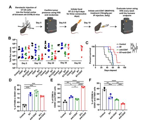 鉴于儿童和成人高级别胶质瘤(HGG)对免疫疗法的反应历来存在差异,研究人员试图探究在儿童模型中观察到的放疗(RT)与抗 CD47 疗法联合应用的显著效果能否应用于成人 HGG。研究人员采用立体定向技术将两种特征明确的小鼠胶质母细胞瘤细胞系 CT-2A 和 SB28 植入 6 至 8 周龄 C57BL/6 小鼠的额叶皮质。将 CT-2A 和表达荧光素酶的 SB28 细胞植入后,通过生物发光成像(BLI)确认肿瘤植入成功,然后将小鼠随机分为四组,并按治疗方案和剂量进行治疗。与弥漫性中线胶质瘤(DMG)模型类似,放疗(RT)后联合抗 CD47 治疗与单药治疗相比,肿瘤生长得到抑制。此外,携带 CT-2A 肿瘤的小鼠生存分析表明,联合治疗显著提高了中位生存期。单独放疗和单独抗 CD47 治疗也显著将中位生存期从 36 天分别提高到 58 天和 57 天。在更具侵袭性的携带 SB28 肿瘤的小鼠中,联合治疗将中位生存期从 30 天提高到 35 天。相反,单独放疗或单独抗 CD47 治疗在携带 SB28 肿瘤的小鼠中并未显著提高中位生存期。接下来,研究人员在终点时评估了肿瘤携带脑组织的巨噬细胞表面标志物谱。综上所述,这些结果有力地表明,在完全免疫功能正常的胶质母细胞瘤小鼠模型中,放疗联合抗 CD47 单克隆抗体治疗效果显著、耐受性良好,并能延长生存期。