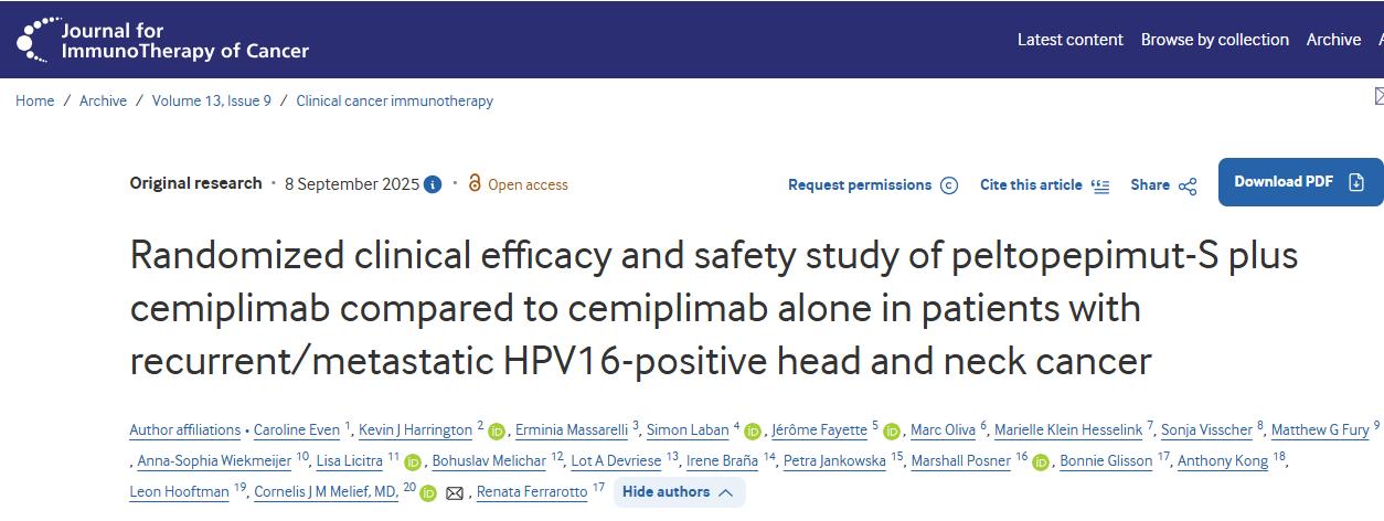 近日,荷兰莱顿大学的教授内利斯莫立夫团队在期刊《Journal for ImmunoTherapy of Cancer》上发表了研究论文,题为“Randomized clinical efficacy and safety study of peltopepimut-S plus cemiplimab compared to cemiplimab alone in patients with recurrent/metastatic HPV16-positive head and neck cancer”,本研究表明将 peltopepimut-S 加入 cemiplimab 并未提高客观缓解率(ORR),反而缩短了中位总生存期(mOS)。在治疗前 PD-L1 联合阳性评分(CPS)<20 的患者中观察到的结果与安慰剂组相比更差(ORR 和 mOS 更低),而在 CPS≥20 的患者中则观察到更好的结果(ORR 更高,mOS 更长)。未来在 CPS≥20 的患者群体中进行药物开发是合理的。