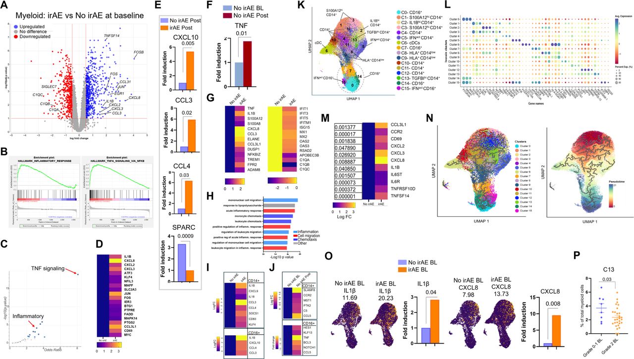 研究人员对外周血单个核细胞(PBMC)单细胞 RNA 测序(scRNA-seq)数据进行无监督聚类分析,揭示了八个不同的髓系细胞亚群,这些亚群由髓系细胞标志物的表达所定义。其中包括六个单核细胞聚类——两个 CD16+聚类、三个 CD14+聚类、一个中间单核细胞聚类、一个浆细胞样树突状细胞(DC)聚类和一个常规 DC 聚类。伪总体差异单细胞基因表达分析显示,在基线(BL)时,免疫相关不良事件(irAE)患者中有超过 250 个基因发生了显著变化(校正 p<0.05 且倍数变化≥1.5),包括白细胞介素 1β(IL1B)和 CXC 趋化因子配体 8(CXCL8)的上调以及免疫抑制基因 SIGLEC-10 和补体基因 C1QA、C1QB 和 C1QC 的下调。基因集富集分析(GSEA)和 MsigDB 通路富集分析表明,在基线时,TNF 信号传导和炎症反应是 irAE 患者中显著上调的两个通路。