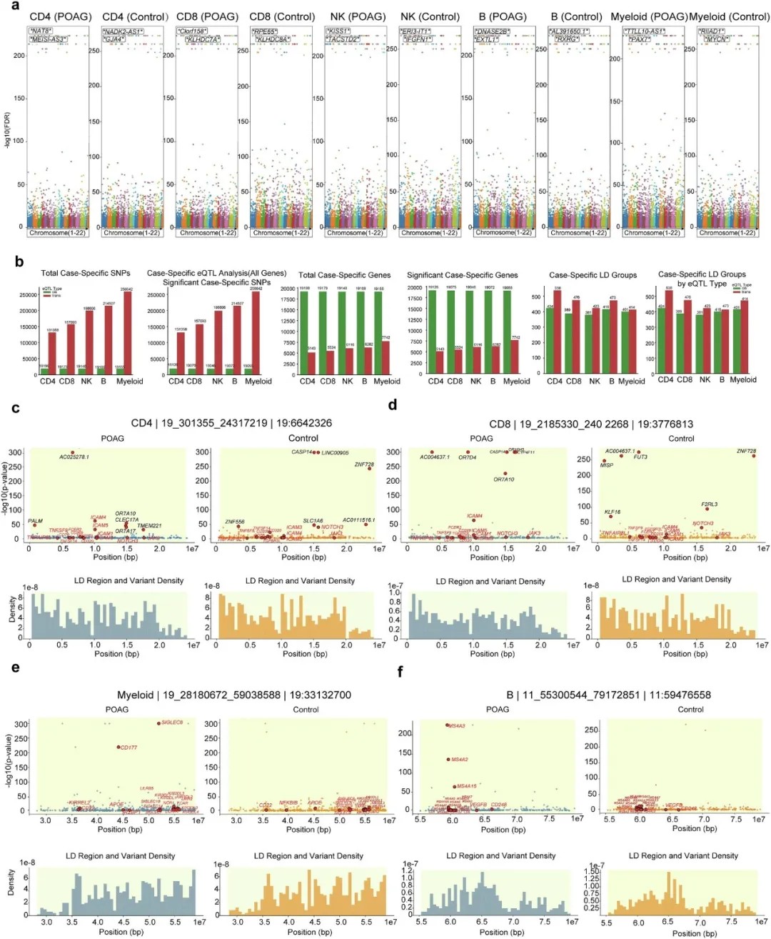 POAG的遗传风险位点并非泛泛调控,而是细胞类型特异性的——例如,某些位点仅影响CD4+ T细胞的基因表达,另一些则作用于髓系细胞;