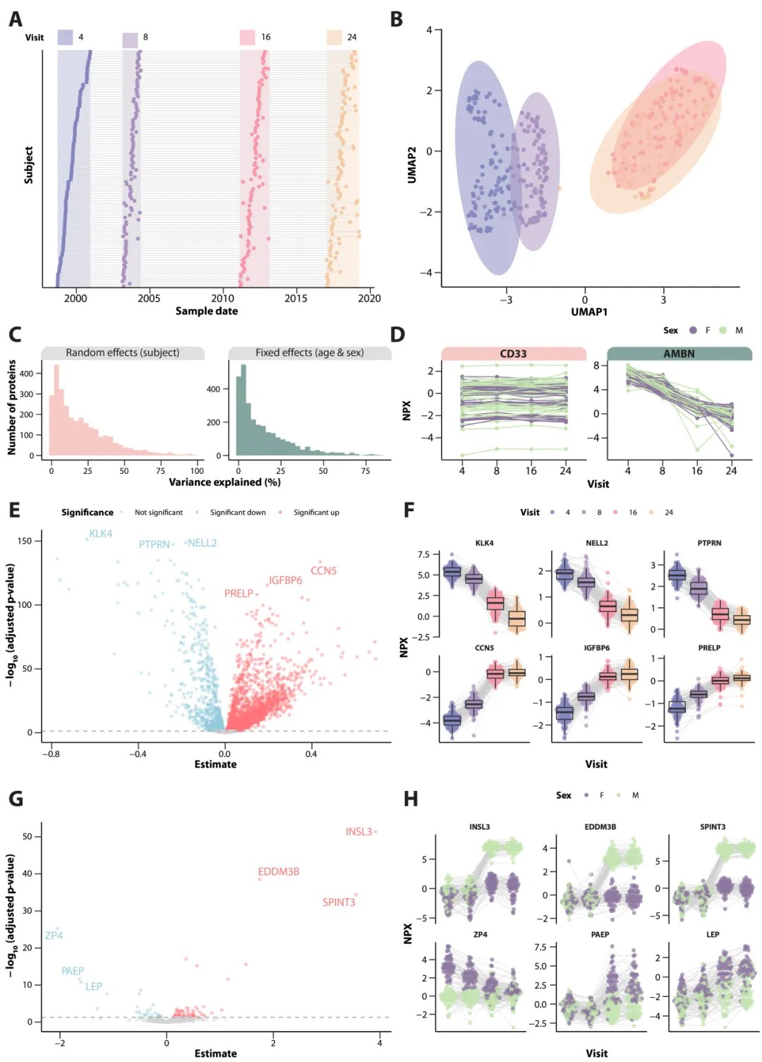针对100名从4岁至24岁人群的纵向分析显示,青春期是血液蛋白质组重塑的关键阶段。例如,与牙釉质形成相关的釉原蛋白在儿童期血液中浓度较高,随发育进程急剧下降;而趋化因子CXCL17等免疫相关蛋白则随年龄增长持续上升。研究还发现,胰岛素样蛋白等与性腺功能相关的蛋白在男性青春期出现爆发式增长,凸显了发育阶段对分子标志物解读的重要性。