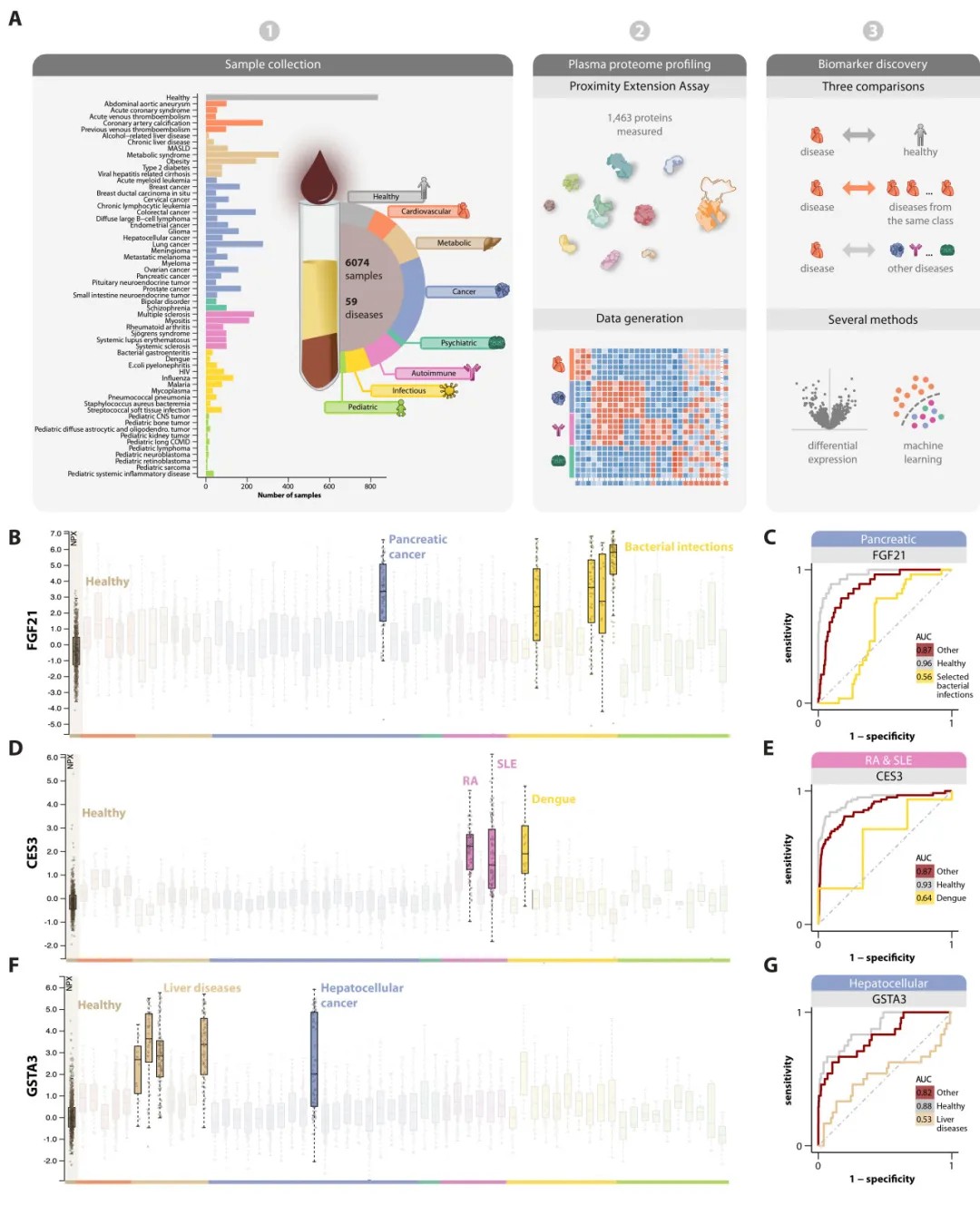 通过机器学习模型对比发现,许多看似疾病特异性的蛋白实则存在跨疾病表达。例如,在胰腺癌中升高的成纤维细胞生长因子,在细菌感染患者中同样高表达;而在肝细胞癌中升高的GSTA3,也与多种慢性肝病共享相似模式。这一发现警示,传统病例-对照研究可能高估标志物特异性,而泛疾病分析能更准确识别真正具有诊断价值的靶点。
