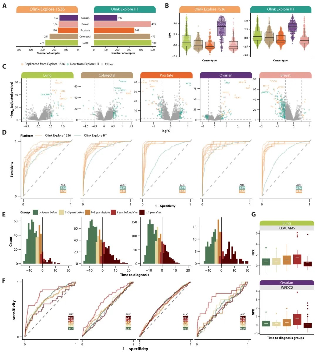 通过整合英国生物银行5万例样本数据,团队验证了蛋白质组在癌症早诊中的潜力。针对肺癌、结直肠癌、卵巢癌等五种高发癌症的分析表明,即使诊断前数年,血液蛋白已呈现异常变化。其中,肺癌预测模型在症状出现前仍能保持0.7的AUC值,而癌胚抗原相关蛋白等标志物随诊断时间临近呈现规律性上升。