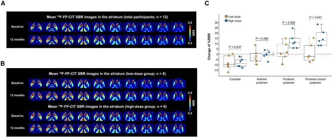 18F-FP-CIT PET是衡量多巴胺转运体(DAT)活性的金标准,直接反映移植细胞的存活和突触重建。结果显示:移植后12个月,后壳核(移植区域)的DAT结合率显著增加:高剂量组中位增长10.7%(p=0.041),低剂量组增长1.0%;更重要的是,后壳核DAT增加与关期运动评分改善呈强相关——这直接证明了移植细胞通过突触重建,恢复了多巴胺能信号传递。
