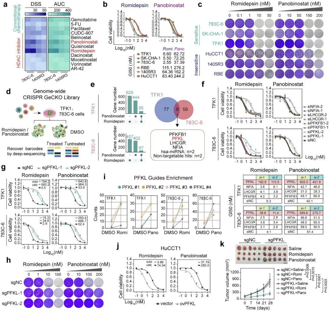 研究团队以胆管癌(CCA)为模型,首先通过全基因组CRISPR-Cas9筛选发现:敲除PFKL的肿瘤细胞,对HDACi(如罗米地辛)的敏感性下降近10倍。这一结果让团队意外——PFKL不是负责糖酵解的代谢酶吗?怎么会影响表观药物疗效?