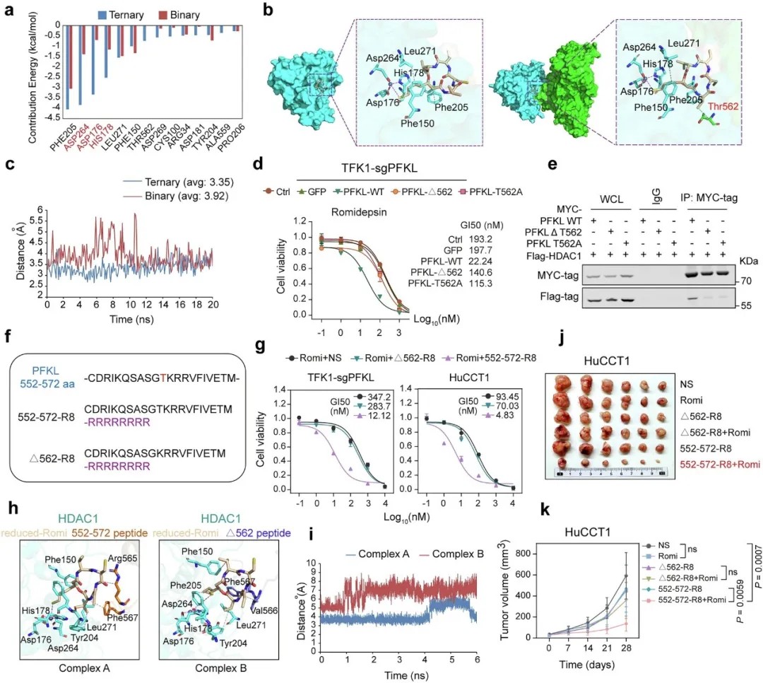 进一步研究揭开谜底:核定位的PFKL能直接结合I类HDAC(HDAC1/2/3/8)——这些是HDACi的主要靶点。通过分子互作实验,团队发现PFKL的C端结构域与HDAC1的170-183位氨基酸结合,而其中两个锌结合残基(D176、H178)是关键——它们不仅介导PFKL与HDAC1的结合,还能拉近HDAC1与罗米地辛的锌结合基团(ZBG),让药物更紧密地螯合HDAC1中的锌离子,抑制其酶活性。