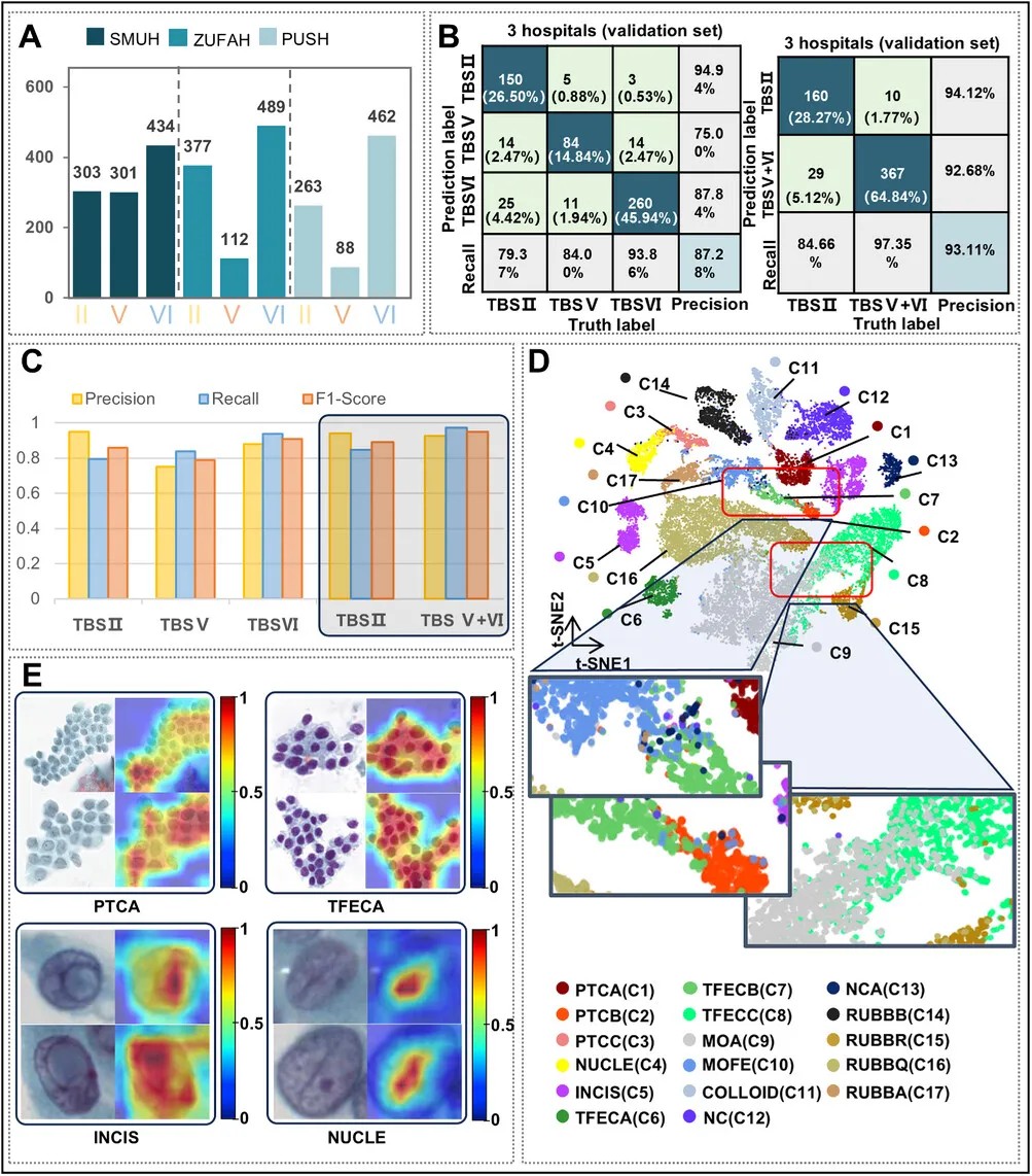 内部验证:TBS I(良性)准确率93.27%,TBS V(可疑恶性)灵敏度85.37%,TBS VI(恶性)灵敏度83.78%,TBS II(良性)特异性97.13%;