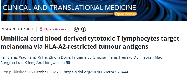 近日,暨南大学附属第一医院研究团队在期刊《Clinical And Translational Medicine》上发表了研究论文,题为“Umbilical cord blood-derived cytotoxic T lymphocytes target melanoma via HLA-A2-restricted tumour antigens”,本研究中,来自脐带血(UCB)和外周血(PB)的抗原特异性 CD8⁺ T 细胞对黑色素瘤显示出相当的细胞毒性效力,尽管其抗原特异性 CD8⁺ T 细胞亚群的组成特征有所不同。候选 T 细胞受体(TCR)能够被肿瘤相关抗原 MART1 和 gp100 有效激活。这种激活促进了可用 TCR 库的扩增,从而缓解了之前 TCR 库有限的限制。