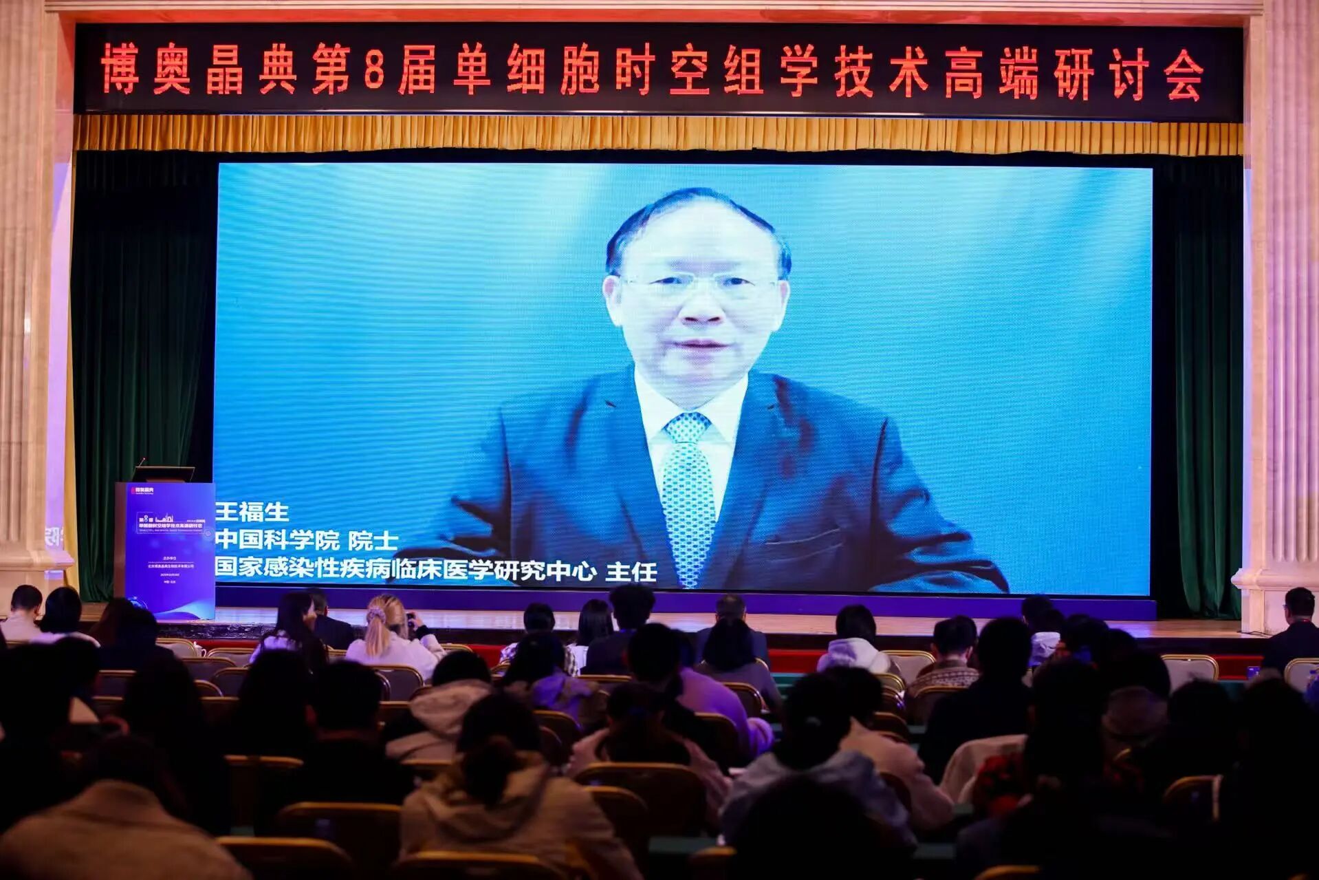 中国科学院院士、解放军总医院第五医学中心感染病医学部主任、国家感染性疾病临床医学研究中心主任、北京大学传染病学系主任王福生作特邀嘉宾致辞。王福生院士首先感谢了大会主办方邢婉丽教授的邀请,并祝贺第八届单细胞时空组学技术高端研讨会的胜利召开。王院士提到,从2018年博奥晶典首届单细胞测序研讨会到今年第八届研讨会,会议以其前瞻的视角和专业深度已发展为单细胞时空多组学领域备受瞩目的品牌,更是搭建了一个连接前沿技术、聚集顶尖专家智慧、创新开放的平台。单细胞时空多组学技术与临床医学的融合与发展,为临床医学研究提供了一个前所未有的技术平台,为全面分析细胞的异质性、解析细胞功能单元、动态追踪生命过程具有重要意义。王院士期待通过本次研讨会上各位专家学者分享的最新技术突破、新理论、新成果、新进展,为解决生命科学技术难题和临床难题提供方案,并通过大会交流激发思想的碰撞,通过跨学科的合作让科研工作者能够聚焦前沿难题,将技术创新切实转化为推动科技进步,服务人类健康的平台,为健康中国作贡献。最后,他预祝本届大会圆满成功,同时愿与会者能够通过大会启迪智慧,共谋发展!