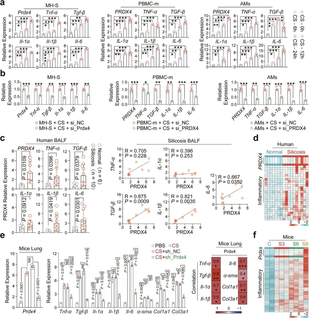 矽肺的发生,始于肺泡巨噬细胞(AMs)对二氧化硅(CS)粉尘的吞噬。这些肺部免疫哨兵在接触粉尘后,会异常激活并分泌大量促炎因子(如TNF-α、IL-1β)与促纤维化因子(如TGF-β),一方面招募更多炎症细胞加剧肺损伤,另一方面诱导肺泡上皮细胞“上皮-间质转化(EMT)”、成纤维细胞“成纤维细胞-肌成纤维细胞转化(FMT)”,最终导致胶原沉积与肺纤维化。然而,巨噬细胞异常激活的上游调控机制始终未明,此项研究正是聚焦这一空白,通过对矽肺患者肺组织与小鼠模型的多组学分析,锁定了PRDX4这一关键分子。