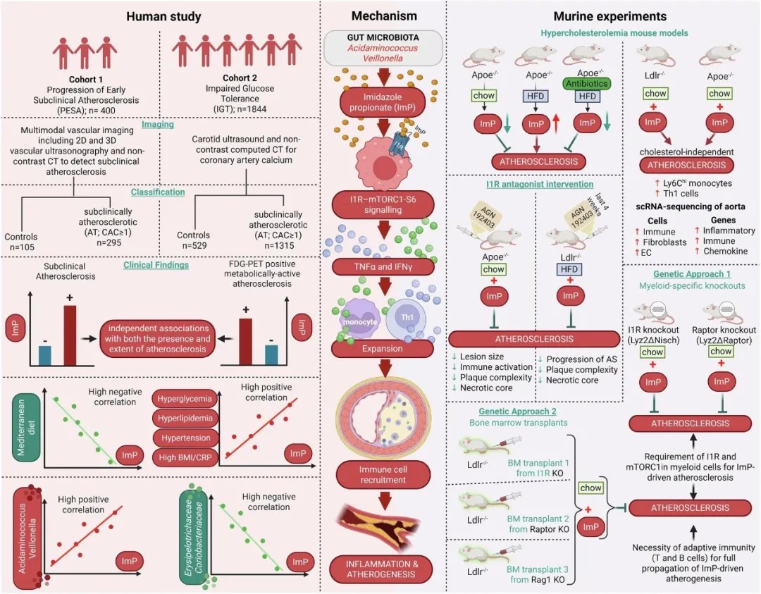 人类与小鼠研究揭示:肠道菌群代谢物咪唑丙酸是动脉粥样硬化的因果驱动因子