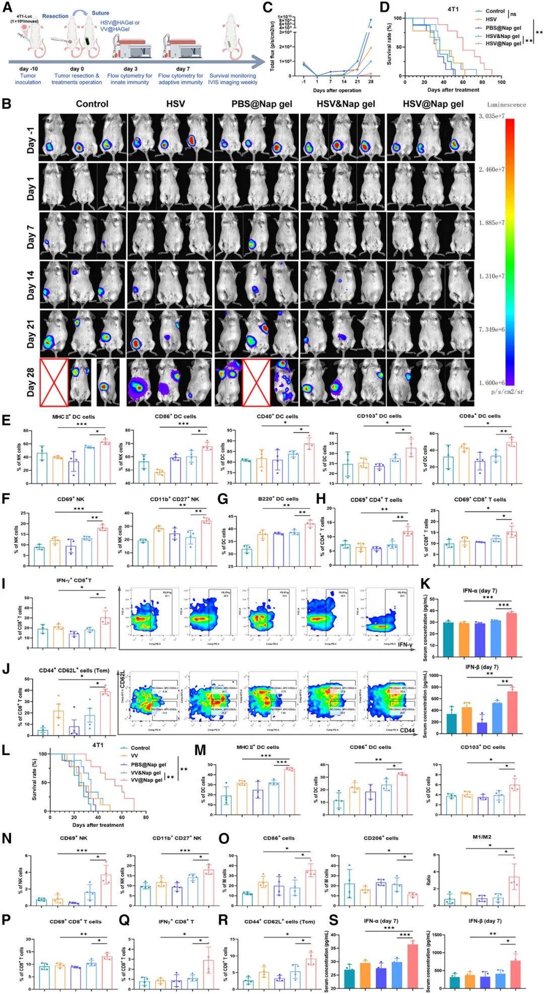 肿瘤切除后立即实施HSV@Nap gel或VV@Nap gel的原位治疗,可控制肿瘤复发与转移