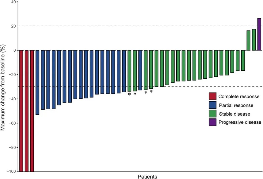 双重标准评估均达高水平响应:按RECIST标准ORR达47%(21/45),其中完全缓解率7%;按更敏感的mRECIST标准ORR高达67%(30/45)。