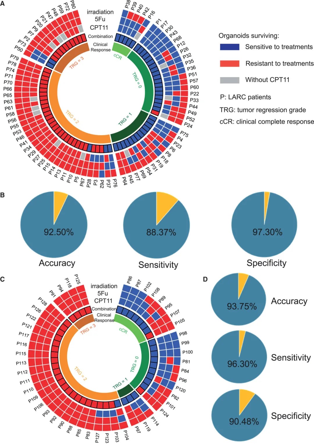 研究团队成功建立了142例直肠癌类器官系(成功率87.12%),并纳入128例患者进行联合放化疗反应测试。结果显示: