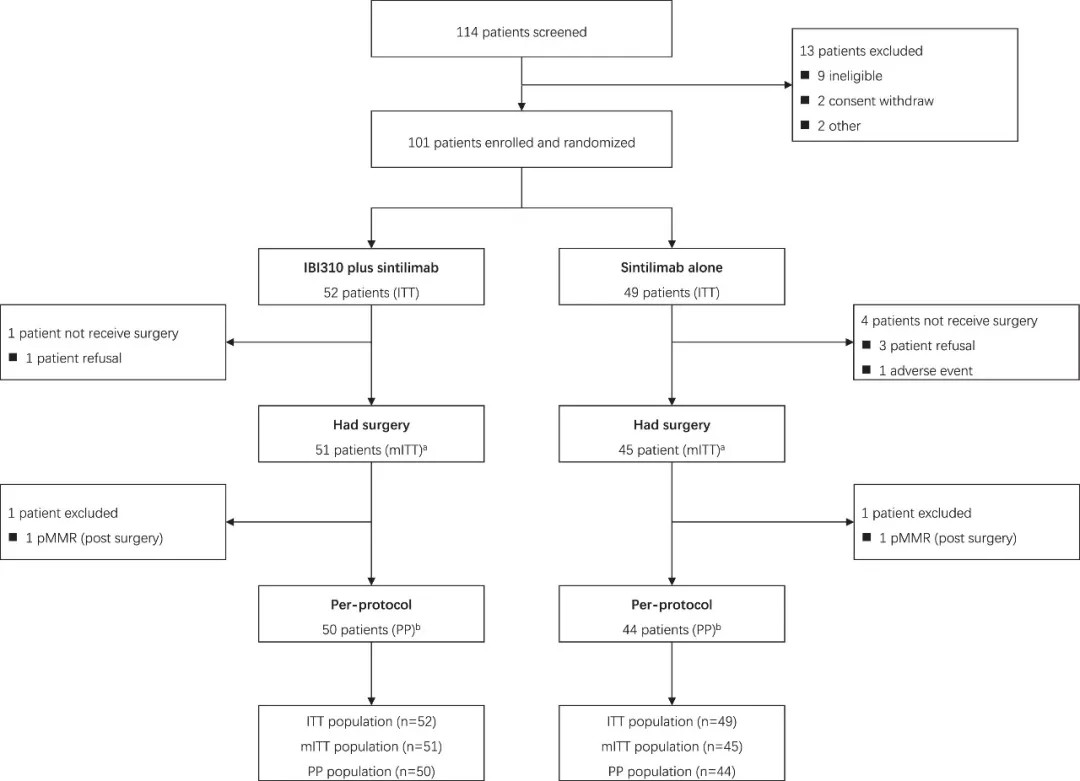 本研究共纳入101例高危局部晚期MSI-H/dMMR结肠癌患者(平均年龄56岁,其中70%为右半结肠肿瘤),这些患者按照2:1比例随机分为两组接受治疗: