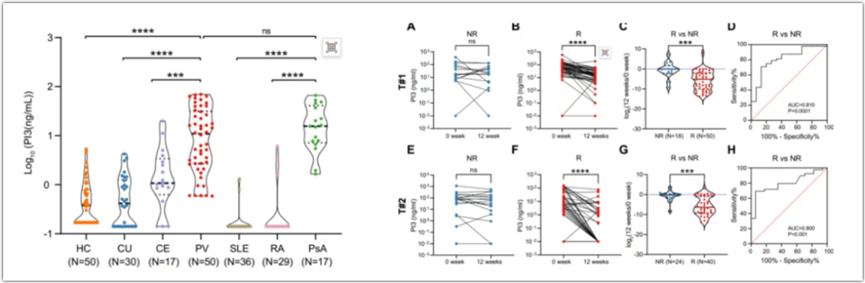 银屑病严重程度蛋白标志物:于晓波团队针对疾病不同严重程度队列进行研究,结果证实,Elafin不仅可用于银屑病的精准诊断,更能有效评估疾病严重程度、预测疗效并进行动态监测,其鉴别银屑病与关节炎的能力尤为突出(AUC高达0.984)。