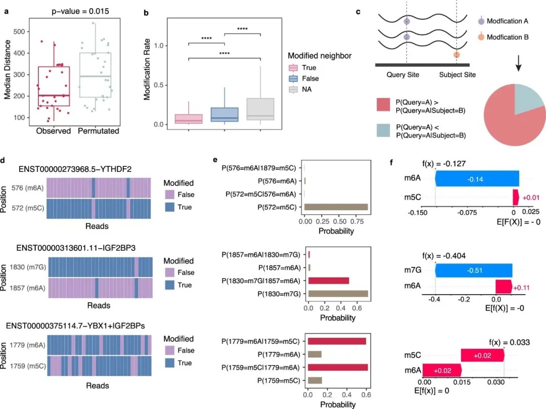 借助纳米孔长读长优势,DirectRM首次在单分子水平解析了修饰间的关联: