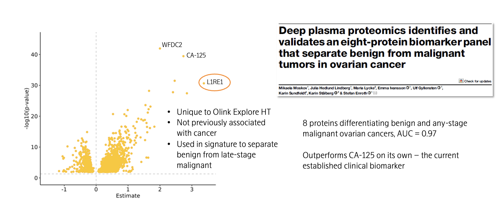 L1RE1(LINE-1反转录转座子元件ORF1蛋白)在广泛人群血浆样本中的检出率仅为8.5%,但在III-IV期恶性卵巢癌患者中的检出率为77.7%(在良性肿瘤队列中为9.6%)。瑞典乌普萨拉大学免疫学、遗传学和病理学系Ulf Gyllensten教授团队利用Olink Explore HT技术,在未经治疗的卵巢癌队列中验证了L1RE1等蛋白在区分良恶性卵巢癌方面的能力。该研究首次提出L1RE1可作为鉴别晚期卵巢癌与良性肿瘤的潜在生物标志物,此前L1RE1尚未被报道与癌症相关。