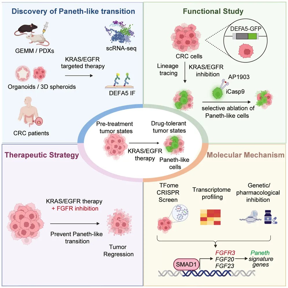 为了深入研究耐药机制,研究团队利用了基因工程小鼠模型、患者来源的类器官和移植瘤模型以及临床标本开展研究。一组实验发现,当KRAS和EGFR同时被抑制后,存活的结直肠癌细胞获得了一种潘氏样细胞状态。