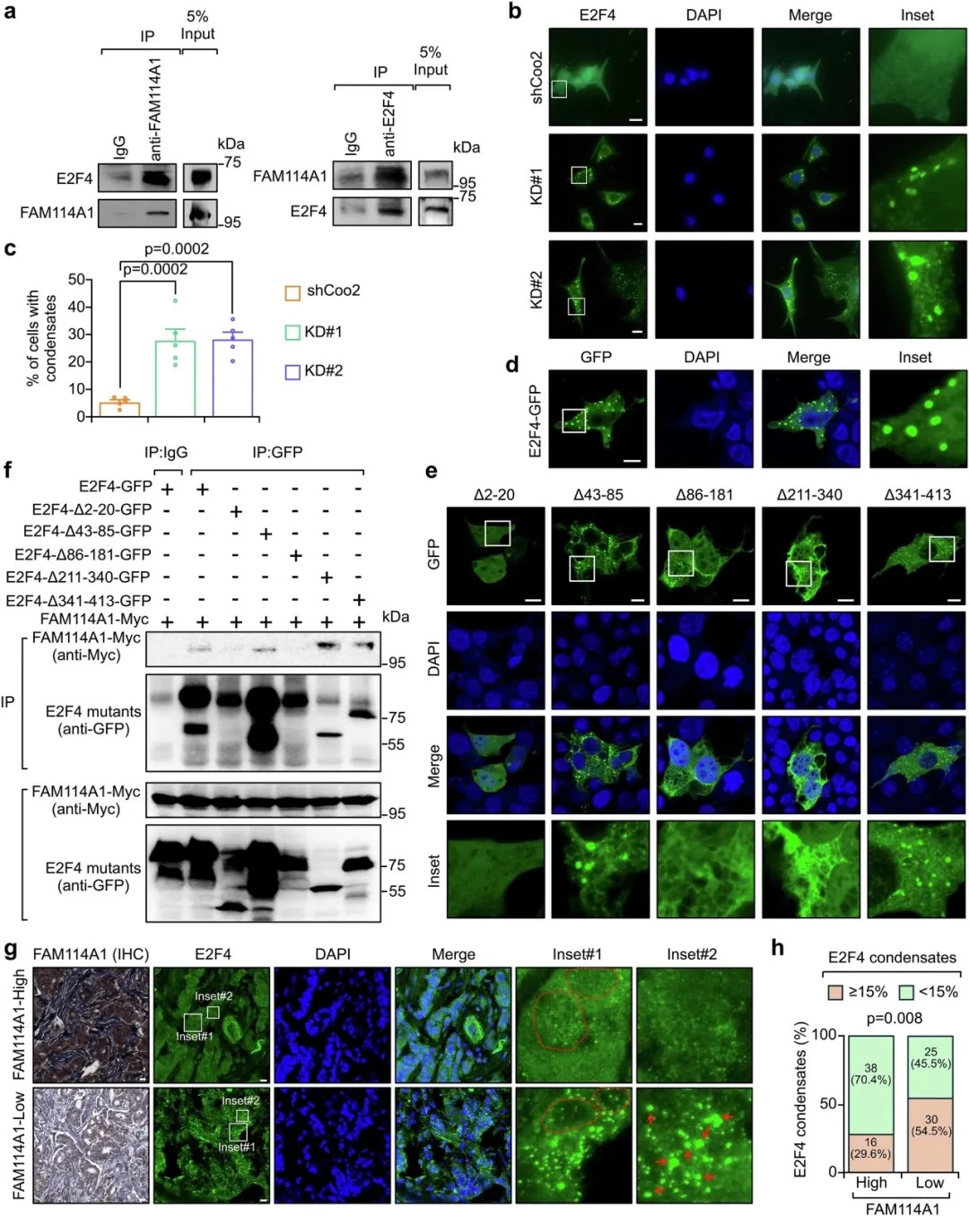 另一方面,研究发现了FAM114A1一个的全新功能——调控蛋白质液-液相分离。FAM114A1与转录因子E2F4结合,阻止其形成液-液相分离凝聚体。液-液相分离是生物大分子通过弱多价相互作用形成无膜细胞器的过程,在基因调控中发挥重要作用。E2F4凝聚体的破坏促进了其核转位,增强了其对Metadherin(MTDH)的转录激活。而MTDH正是一种已知的免疫抑制分子,能够抑制肿瘤抗原呈递。