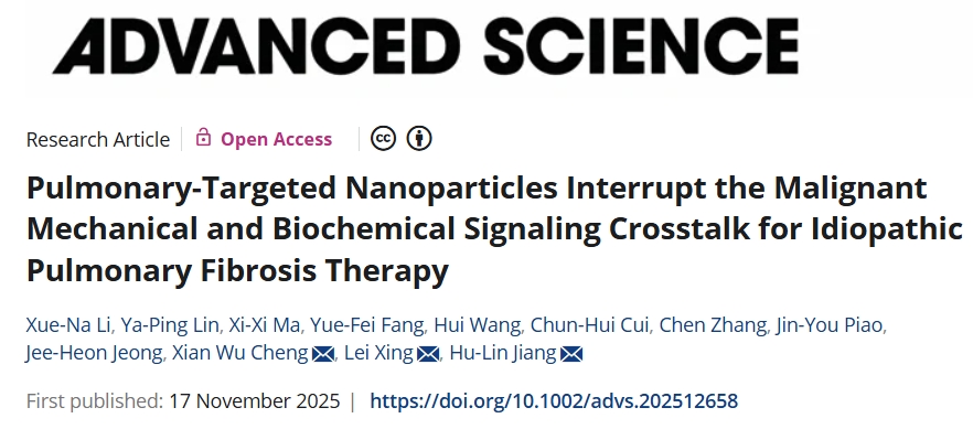 11月17日,延边大学附属医院/中国药科大学研究团队在期刊《Advanced Science》上发表了题为“Pulmonary-Targeted Nanoparticles Interrupt the Malignant Mechanical and Biochemical Signaling Crosstalk for Idiopathic Pulmonary Fibrosis Therapy”的研究论文,本研究中,研究人员开发了一种可吸入的肺靶向脂质纳米颗粒,以有效治疗 IPF,通过阻断肺部机械-生化信号恶性交互作用。研究结果表明,VB-RT NPs 有效地逆转了纤维化肺中失调的机械-生化信号交互作用,并阻止了纤维化进展,为 IPF 提供了一种有前景的治疗手段。