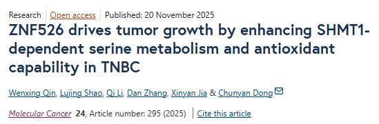 近日,同济大学附属东方医院研究人员在期刊《Molecular Cancer》上发表了研究论文,题为“ZNF526 drives tumor growth by enhancing SHMT1-dependent serine metabolism and antioxidant capability in TNBC”,本研究中,研究人员观察到 ZNF526 在三阴性乳腺癌(TNBC)中高表达,且其表达水平升高与更差的临床预后相关。功能检测表明,ZNF526 过表达促进 TNBC 细胞生长,而其敲低则抑制肿瘤生长。代谢激活增加了谷胱甘肽(GSH)的生成,降低了活性氧(ROS)水平,并增强了细胞抗氧化防御能力,从而促进了 TNBC 的进展。本研究结果表明,ZNF526 通过 SHMT1 介导的代谢控制,是三阴性乳腺癌(TNBC)中氧化还原平衡的新调节因子,这使其成为 TNBC 的潜在治疗靶点。