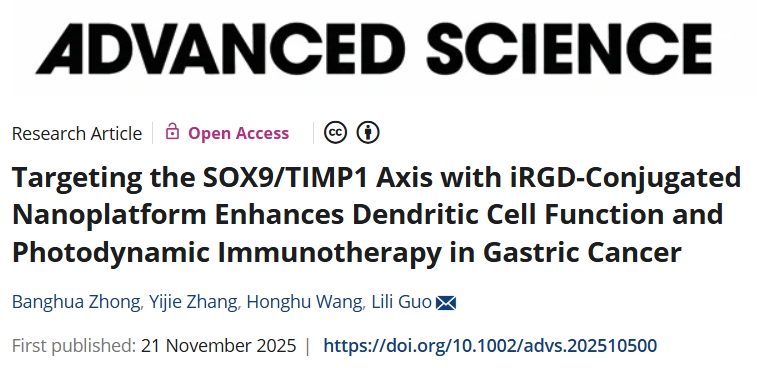 近日,中国医科大学附属第一医院研究团队在期刊《Advanced Science》上发表了研究论文,题为“Targeting the SOX9/TIMP1 Axis with iRGD-Conjugated Nanoplatform Enhances Dendritic Cell Function and Photodynamic Immunotherapy in Gastric Cancer”,本研究通过整合单细胞 RNA 测序(scRNA-seq)和空间转录组学(ST-seq)分析揭示了 SOX9/TIMP1/FAK/PI3K 轴会阻碍胃癌(GC)中树突状细胞(DC)的成熟以及抗肿瘤免疫。研究人员开发了PLGA纳米颗粒(NPs)。体外实验表明,这些纳米颗粒增强了细胞摄取和溶酶体逃逸,在近红外(NIR)照射下抑制 SOX9 表达并产生活性氧(ROS)和一氧化氮(NO)。这种双重作用显著抑制了胃癌细胞的增殖、迁移和侵袭,同时促进了 DC 的成熟和 CD8⁺ T 细胞的活化。体内实验表明,iRGD 修饰增强了纳米颗粒在肿瘤中的积累,NP 介导的 PDT 与 SOX9 沉默协同作用抑制了胃癌异种移植瘤的生长。从机制上讲,NPs@si-SOX9/CL 能够阻断 SOX9 驱动的 TIMP1 转录激活,逆转 FAK/PI3K 信号传导,并恢复树突状细胞的功能。因此,肿瘤浸润的成熟树突状细胞和细胞毒性 T 淋巴细胞显著增加,重塑了免疫抑制微环境。这种纳米平台为增强胃癌免疫治疗提供了一种有前景的策略,能够精准靶向肿瘤内在的免疫抑制,并增强光动力疗法的疗效。