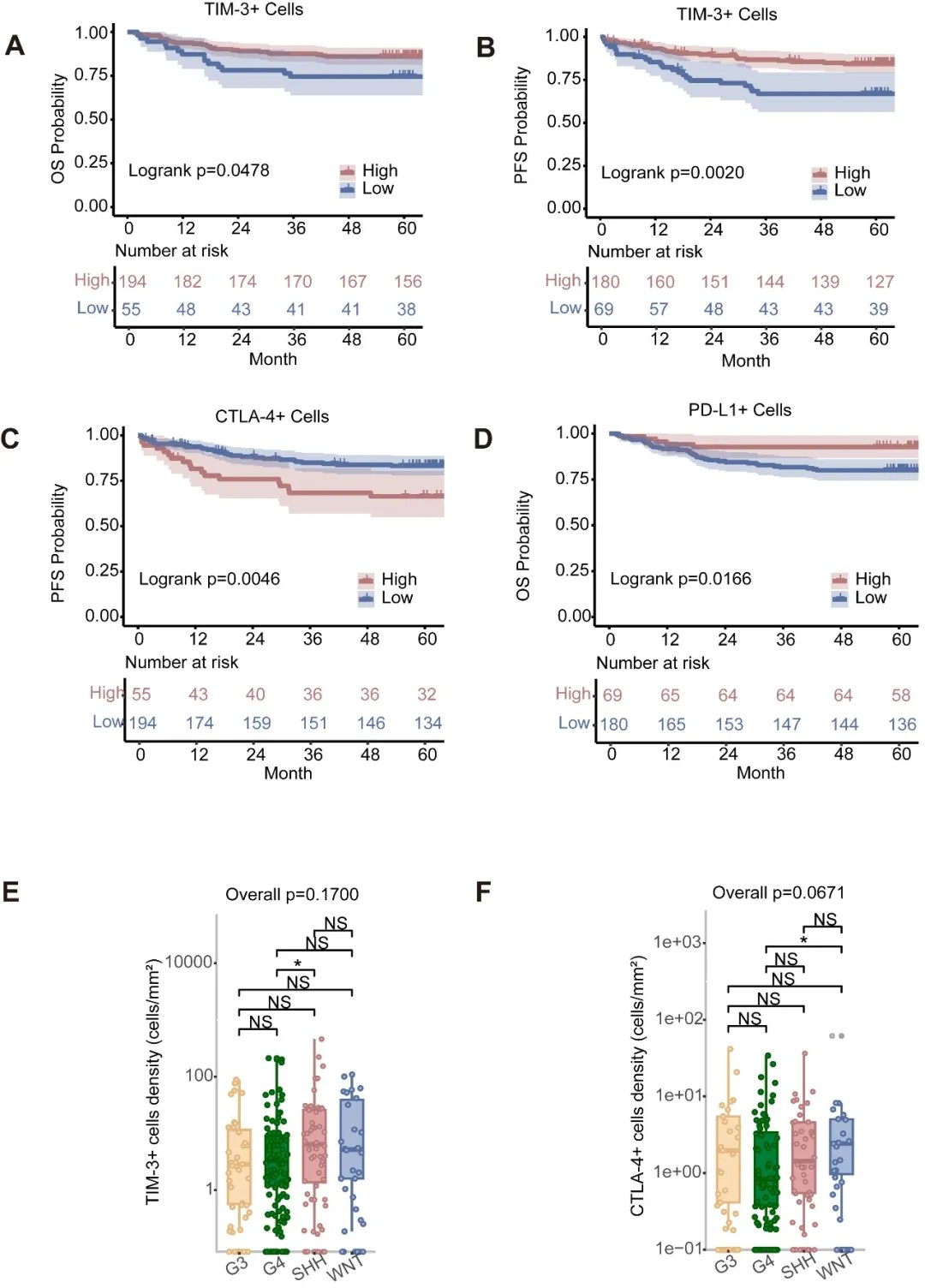 本研究纳入了249例2014年至2020年期间确诊的儿科髓母细胞瘤患者样本,采用六种多重免疫荧光面板对组织微阵列进行分析。这些面板覆盖了T细胞亚群、巨噬细胞、NK细胞、三级淋巴结构和免疫检查点等关键免疫标志物。