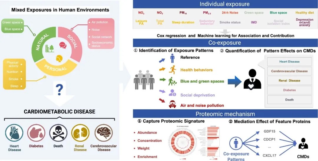 其中,“社会剥夺”模式对健康的危害最大——处于这种环境中的人患心血管代谢疾病的风险比参照组高出15%-40%。研究人员首次发现CDCP1、CXCL17等炎症和免疫蛋白是连接环境暴露与疾病的关键介质。