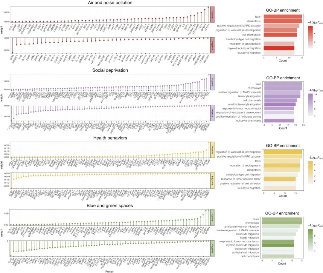 为了深入探索环境暴露影响健康的内在机制,研究团队对2911种血浆蛋白进行了分析。不同暴露模式具有独特的蛋白质特征,尤其是社会剥夺和空气噪音污染模式。