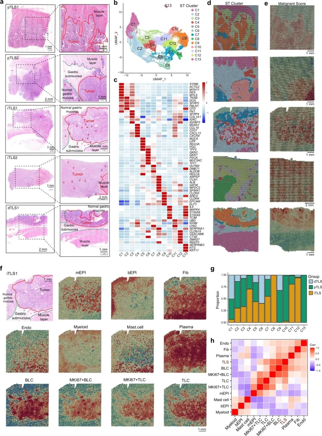 三级淋巴结构(TLS)是肿瘤微环境中形成的异位淋巴组织,在抗肿瘤免疫中发挥关键作用。本研究通过对30例胃癌标本进行单细胞和空间转录组分析,根据三级淋巴结构的空间分布将胃癌分为三类:肿瘤内TLS、瘤周TLS和无TLS胃癌。
