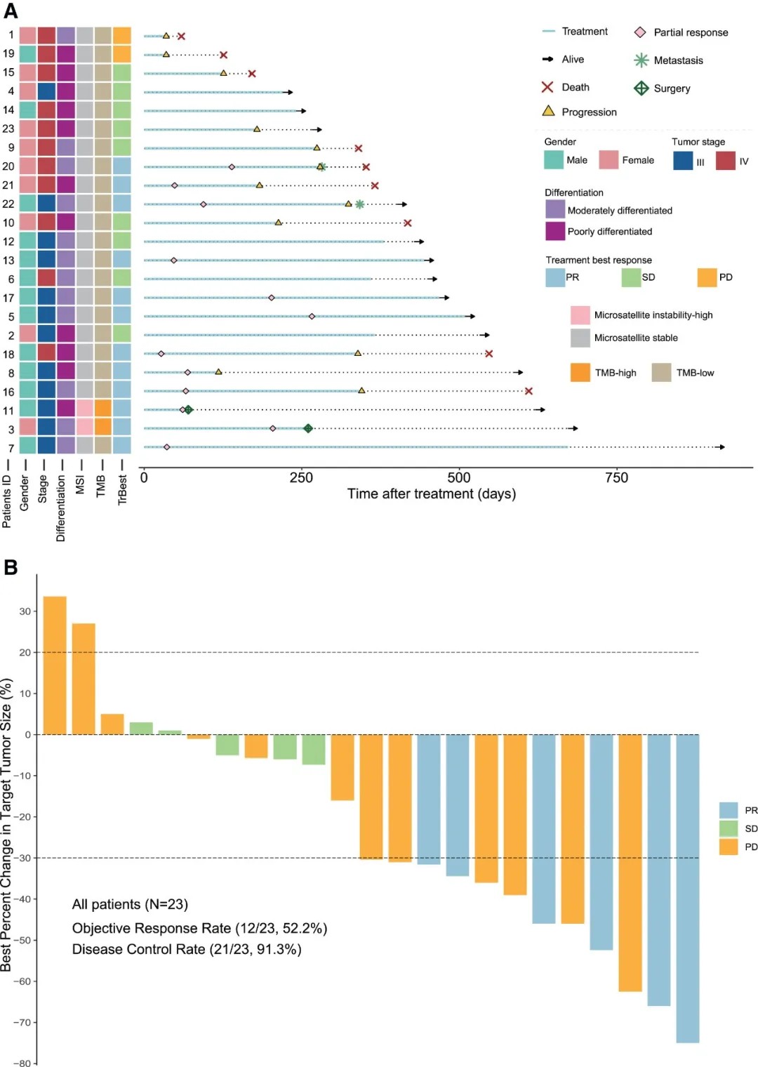 研究还进行了探索性生物标志物分析,发现肿瘤PD-L1表达水平与治疗反应相关。此外,研究还观察到一个有趣现象:所有同时存在微卫星不稳定性高和肿瘤突变负荷高的患者均对治疗产生反应,尽管因样本量小未达到统计学显著性。