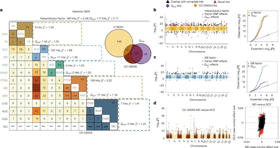 研究团队应用基因组结构方程模型,在主要具有欧洲遗传祖先的数据集中模拟了14种疾病间的遗传重叠。五因子模型被证明最能拟合数据,包括:强迫相关障碍(定义疾病:神经性厌食症、强迫症)、精神分裂-双相情感障碍、神经发育障碍(定义疾病:自闭症谱系障碍、注意缺陷/多动障碍)、内化障碍(定义疾病:创伤后应激障碍、重度抑郁症、焦虑症)和物质使用障碍。