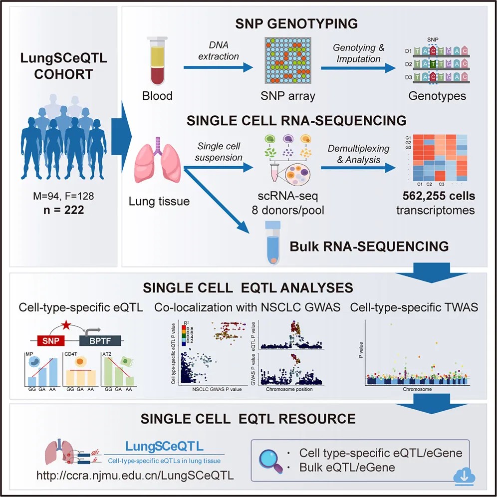 近日,南京医科大学马红霞/沈洪兵/朱猛团队等在国际知名期刊《Cell Genomics》上发表一项重磅研究:通过对222个样本87万个肺细胞进行测序,构建了迄今为止最大的肺单细胞 eQTL 图谱,发现了4341个独立的基因表达数量性状位点。首次在单细胞精度系统揭示肺癌遗传风险的细胞特异性调控机制。eQTL是基因组中调控基因表达的关键开关,近半数(47%)已确立的非小细胞肺癌风险位点表现出细胞类型特异性的多效遗传调控。这一发现解释了为什么同一基因变异在不同个体中会引发不同后果。