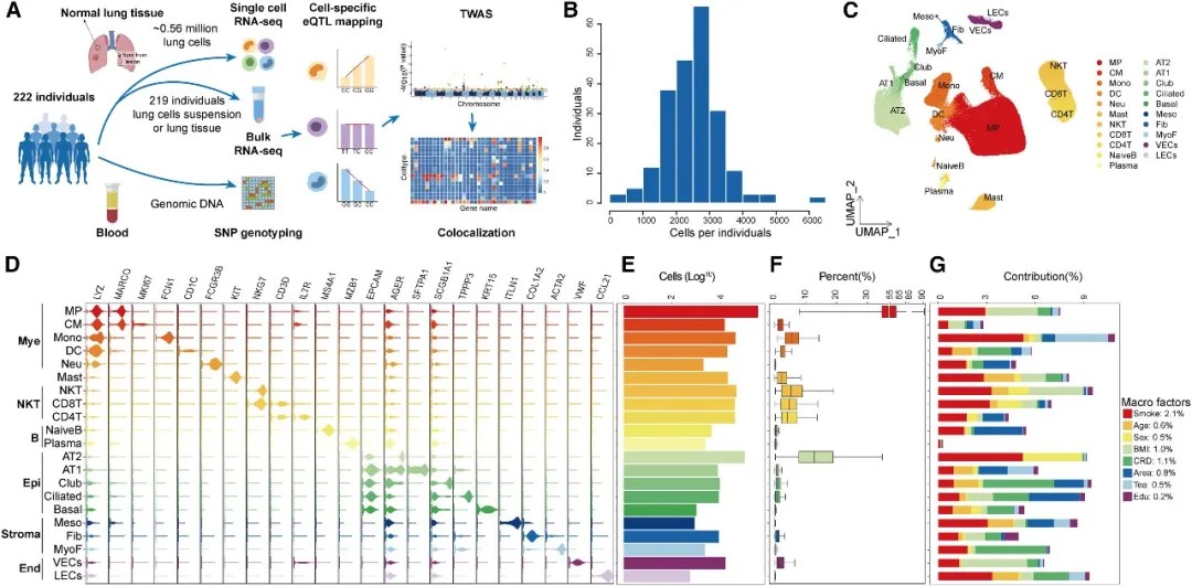研究团队采用多重单细胞RNA测序技术,对222名中国个体的正常肺组织进行高精度分析,共生成了来自870,061个细胞的scRNA测序数据,经过去复用、去除双重体和质量控制后,保留了来自222名个体的562,255个细胞,平均每位供体2,533个细胞,涵盖了21种不同的肺细胞类型。